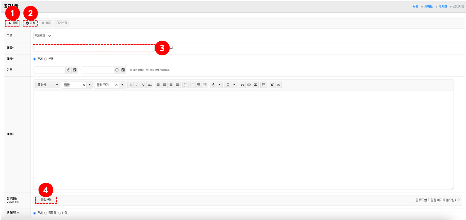 • 제목/내용 입력: 제목 입력란 ②과 내용 입력란에 작성 → 필요 시 최상위 표시를 체크한다.