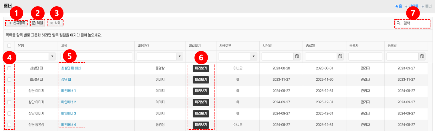 • 선택 박스: 목록의 체크박스 ④를 클릭 → 배너를 개별/다중 선택한다.