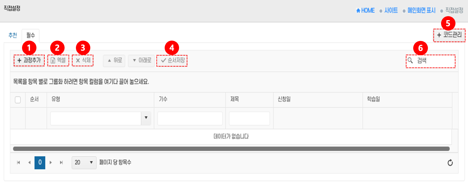 과정추가: 상단의 과정추가 버튼 ①을 클릭 → 새로운 과정을 등록한다.