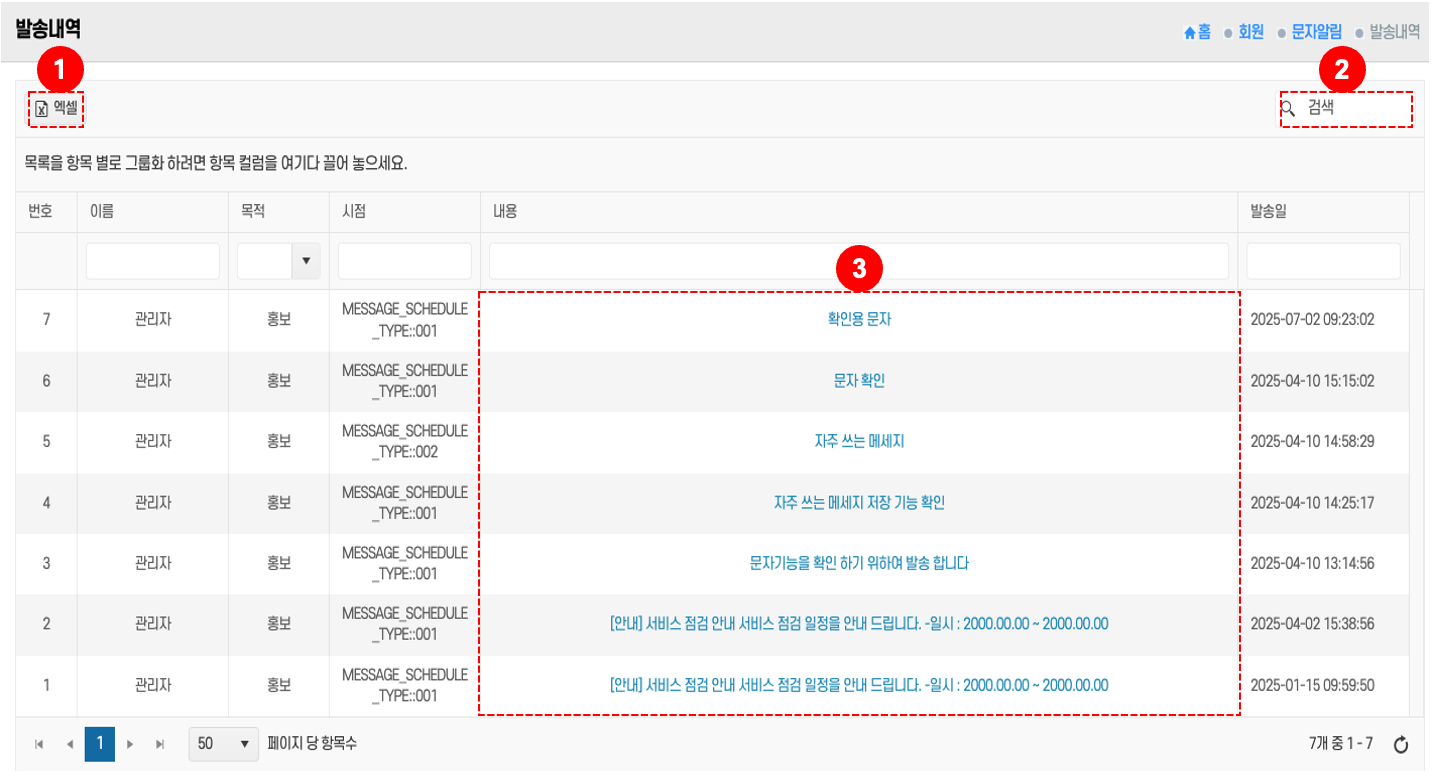 발송 내용 확인: 목록의 발송 내용 ③을 클릭 → 메시지 세부 내역을 확인한다.