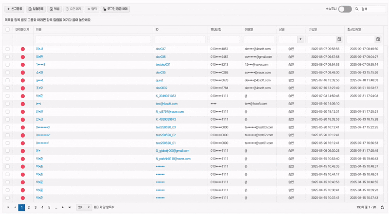기능설명 1. 이름/ID 클릭 회원 이름이나 ID를 클릭하면 해당 회원의 상세정보 화면으로 이동할 수 있다. 사용방법 상세정보 확인: 목록에서 회원의 **이름 또는 ID(①)**를 클릭 → 상세정보 화면으로 이동한다.