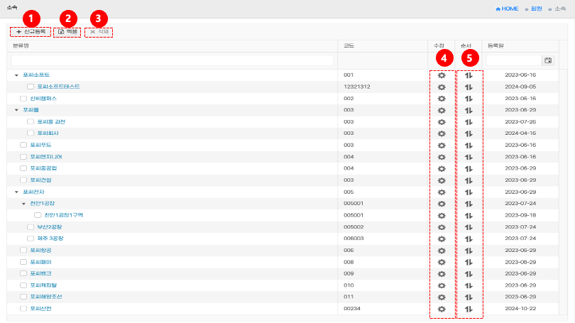 신규등록: 상단의 신규등록 버튼 ①을 클릭 → 소속을 추가한다.