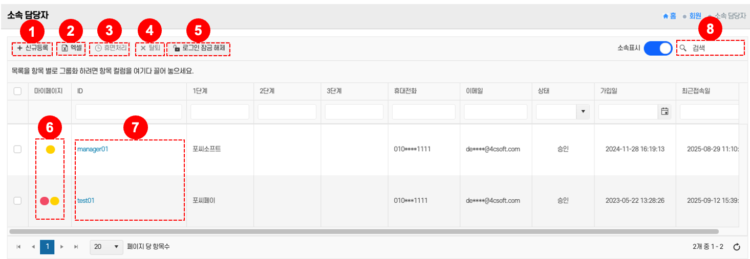 신규등록: 상단의 신규등록 버튼 ①을 클릭 → 소속 담당자를 등록한다.