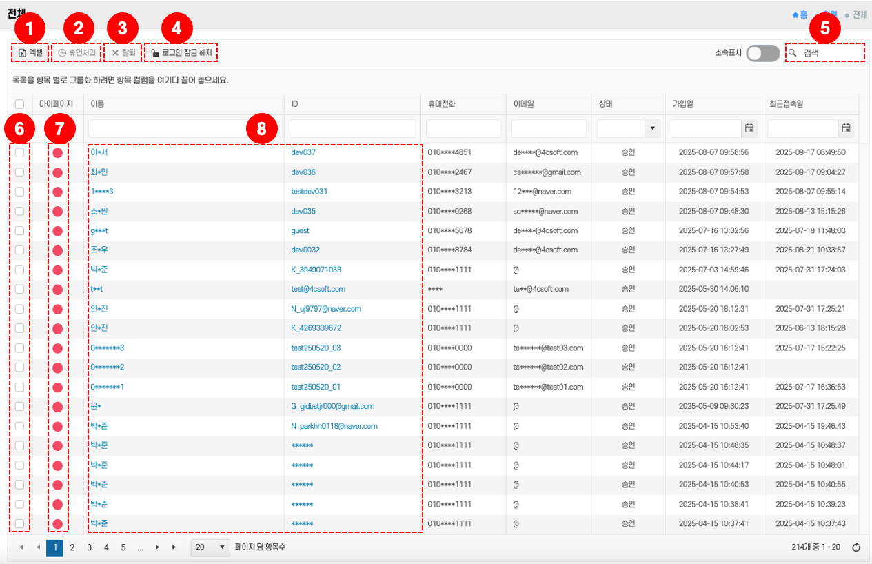 • 체크박스: 여러 회원을 동시에 작업할 경우 선택박스 ⑥을 활용한다.