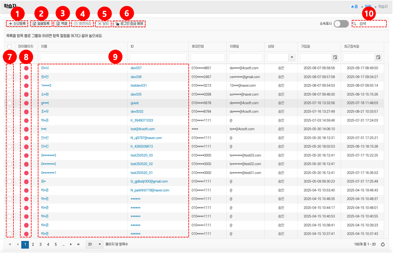 개별 선택: 왼쪽 체크박스 ⑦을 클릭 → 학습자를 선택하여 관리 작업 수행.